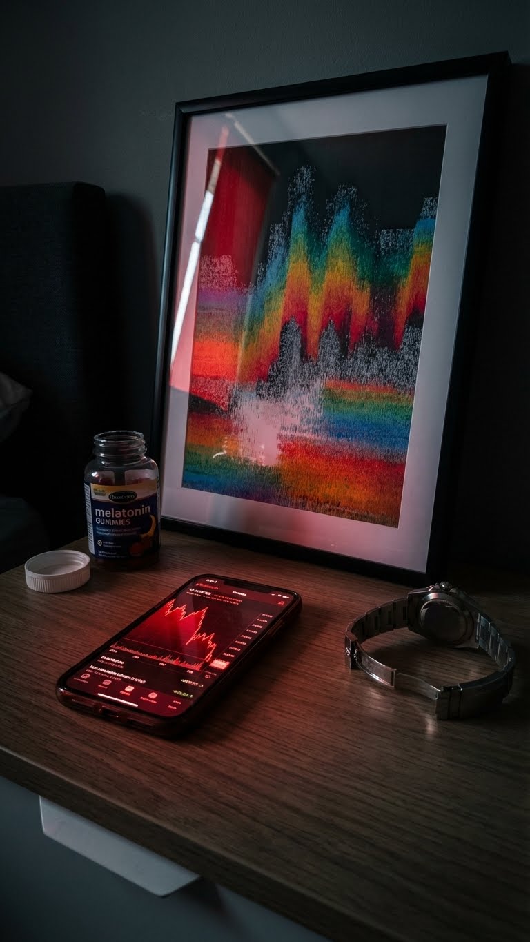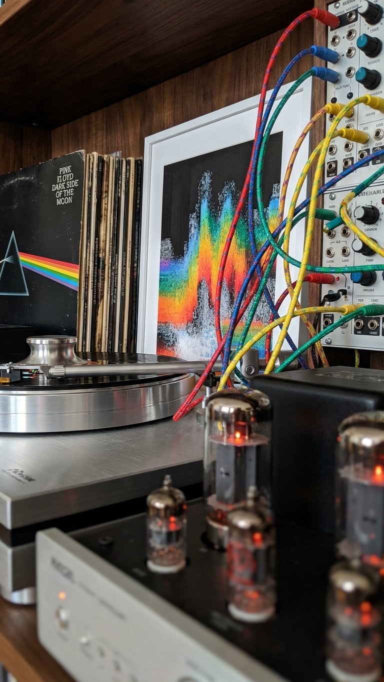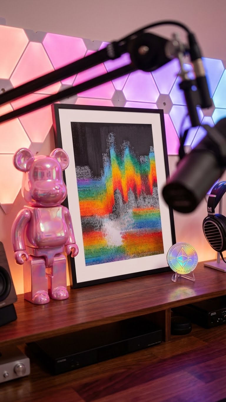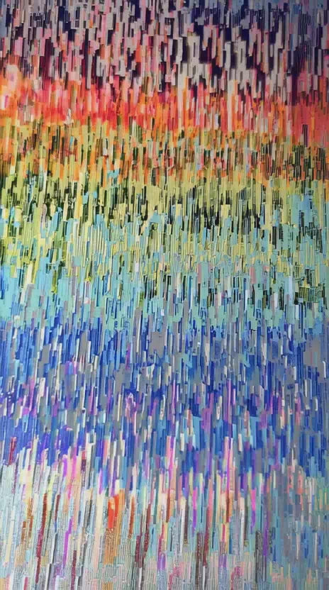 Uma obra de arte explora a tensão entre um espectro de cores vibrantes e a estática digital monocromática.