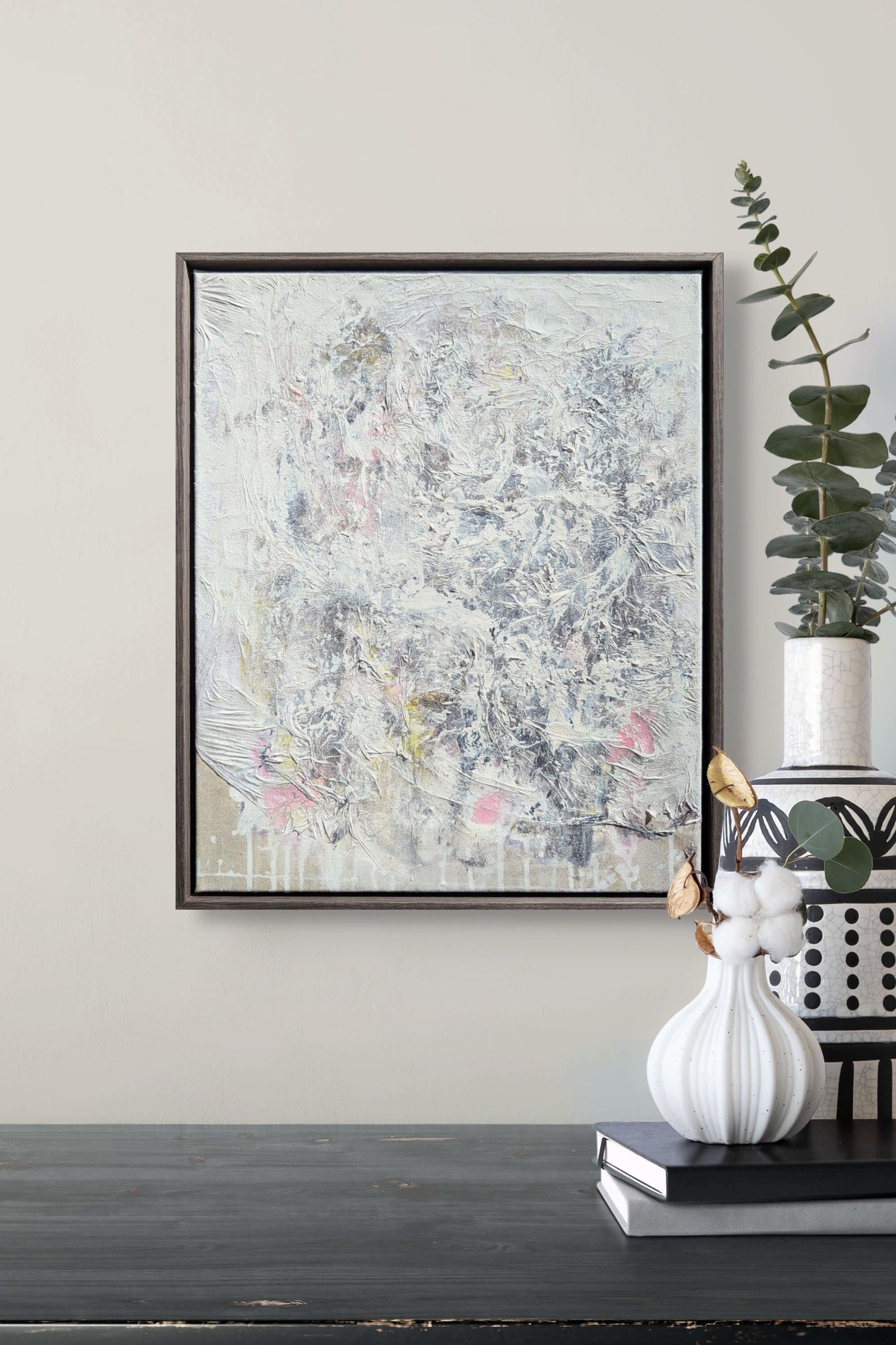 Uma pintura abstrata única, definida pela sua textura rica e subtil. Esta obra foi criada utilizando papel de seda e tinta acrílica sobre tecido 100% algodão isento de ácido.